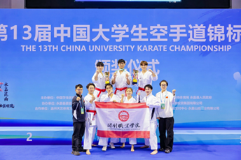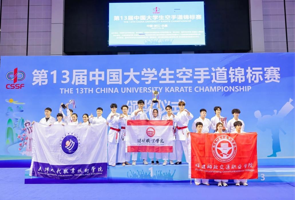 在2025年11月25日至28日于浙江永嘉举办的第十三届中国大学生空手道锦标赛上,我校空手道代表队再创辉煌,一举夺得男子团体型和混合团体型双料冠军,同时在其他项目中斩获一银一铜,充分展现了学校体育教育的卓越成果。
