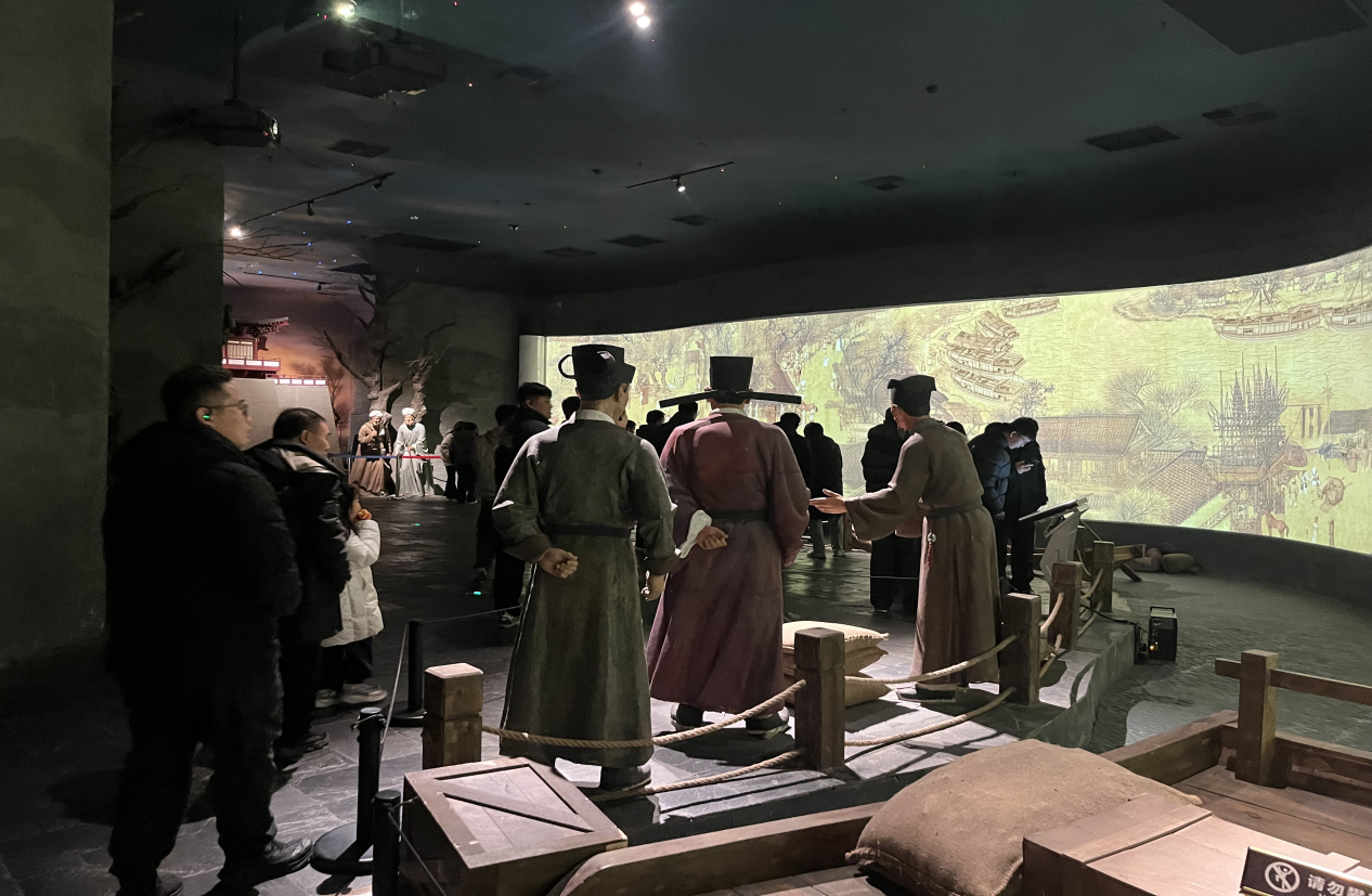 来到3号展厅“《清明上河图》专题展”。利用高科技手段展示了动态版《清明上河图》,让画中人物、牲畜“动起来”,还设有1:1虹桥巨型模型以及宋代街市场景复原,生动再现了北宋东京汴河两岸的市井生活。